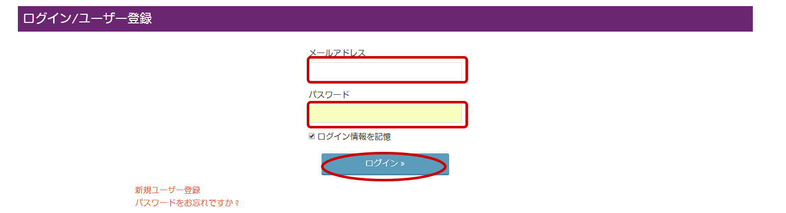 9) 会員登録完了メールに記載されているメールアドレスとパスワードを入力し、「ログイン」ボタンをクリックします。